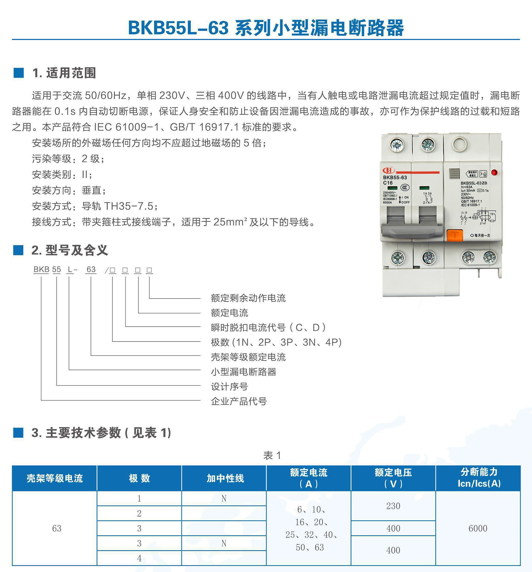 BKB55L-63ZB系列自診斷小型漏電斷路器適用于交流50/60Hz,額定電壓至230V,額定電流至63A的線路中,作為人身觸電和設備漏電保護之用;剩余電流動作功能自診斷、失效報警,當產品漏電保護功能出現異常時會通過報警模塊提醒用戶;并可用于線路和電氣設備的過載及短路保護。本產品符合GB/T 16917.1、IEC 61009-1標準。
