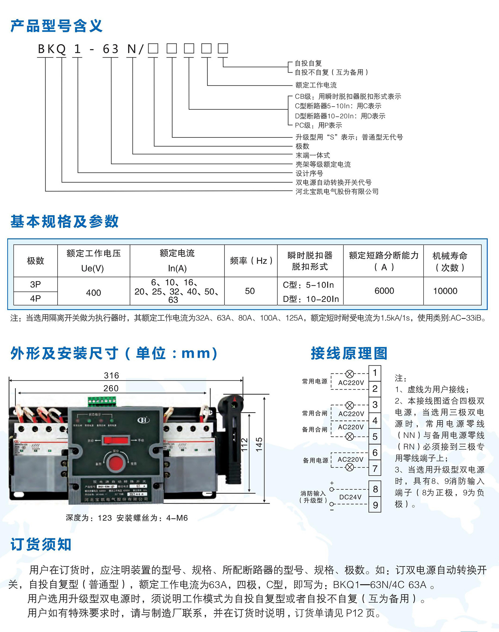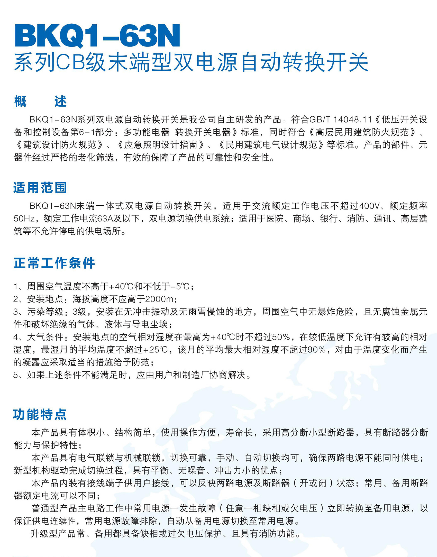 BKQ1-63N末端一體式雙電源自動(dòng)轉(zhuǎn)換開(kāi)關(guān),適用于交流額定工作電壓400V及以下、額定頻率50Hz,額定工作電流63A及以下的雙電源切換供電系統(tǒng);產(chǎn)品具有電氣聯(lián)鎖與機(jī)械聯(lián)鎖,確保兩路電源不能同時(shí)供電;切換可靠,手動(dòng)、自動(dòng)切換均可;新型機(jī)構(gòu)驅(qū)動(dòng)完成切換過(guò)程,具有平衡、無(wú)噪音、沖擊力小的優(yōu)點(diǎn);廣泛適用于醫(yī)院、商場(chǎng)、銀行、消防、通訊、高層建筑等不允許停電的供電場(chǎng)所。產(chǎn)品符合GB/T 14048.11《低壓開(kāi)關(guān)設(shè)備和控制設(shè)備 第 6-1 部分:多功能電器 轉(zhuǎn)換開(kāi)關(guān)電器》。