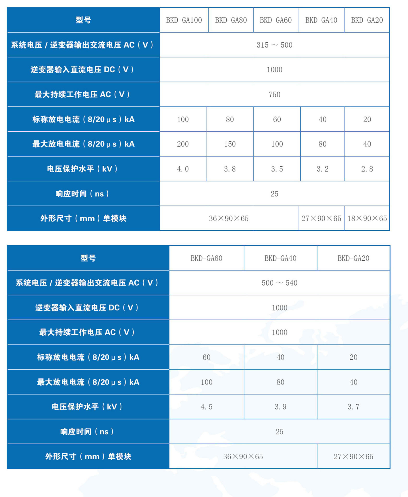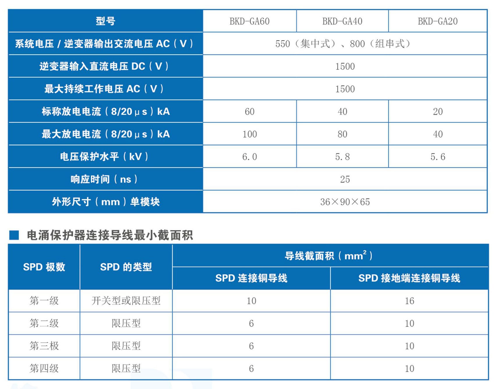BKD系列新能源專用電涌保護器均采用了非線性特性極好的過電壓保護元件。在正常情況下,電涌保護器處于高阻狀態,泄漏漏電流極低。當系統出現電涌過電壓時,電涌保護器立即在納秒級內導通,將過電壓的幅值限制在設備的安全工作范圍內,同時將電涌能量導入大地釋放掉;隨后電涌保護器又迅速變為高阻狀態,從而不影響風電、光伏系統的正常工作。產品符合GB/T 18802.11、GB/T 18802.11標準。