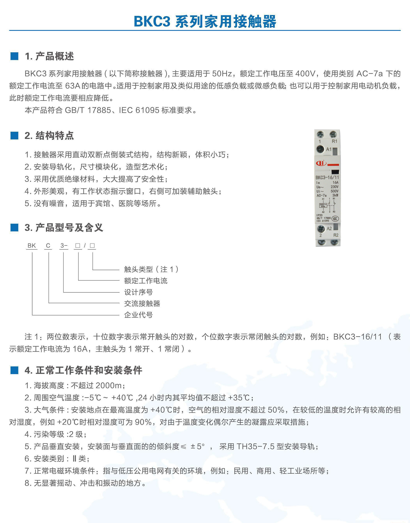 BKC3系列家用接觸器適用于交流50Hz,額定工作電壓至400V,使用類別 AC-7a下的額定工作電流至63A,用于控制家用及類似用途的低感或微感負載,也可以用于控制家用電動機負載。本產品應用于賓館、公寓等場所,實現自動化控制功能。產品符合GB/T 17885、IEC 61095標準。